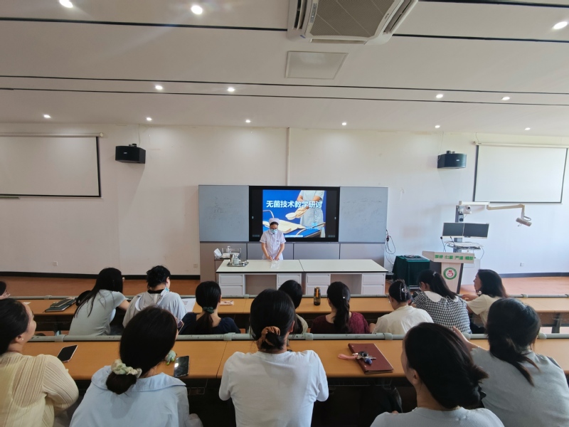曾静老师先介绍了目的:预防交叉感染、保障患者安全、提升护理质量等,接着无菌技术操作中的各项细节进行介绍,包括:①操作前的准备无菌包布的折叠方法、化学指示胶带的填写物品的检查与摆放环境准备等;②操作的重点无菌包打开使用操作,包括无菌包检查、打开方法无菌物品取用规范;无菌溶液取用操作,包括无菌溶液质量的检查、消毒顺序为:第一次消毒从瓶口中间往上消毒,第二次消毒从中间往下消毒;冲洗瓶口不可断流、不可过多等。戴无菌手套时,注意手套内外面不可相碰,双手位置不可过低,要始终保持腰部以上,肩部以下。③操作后的用物处置,将用物按照院感要求分类处置。讲解结束后在场的老师们针对相关问题进行了热烈的讨论和分享,老师们的问题探讨与经验分享,让无菌技术的教学重点更清晰、难点突破方法更具体,为后续在实训课中指导学生掌握操作规范、强化无菌观念提供了宝贵的教学参考,进一步保障护理专业教学质量。